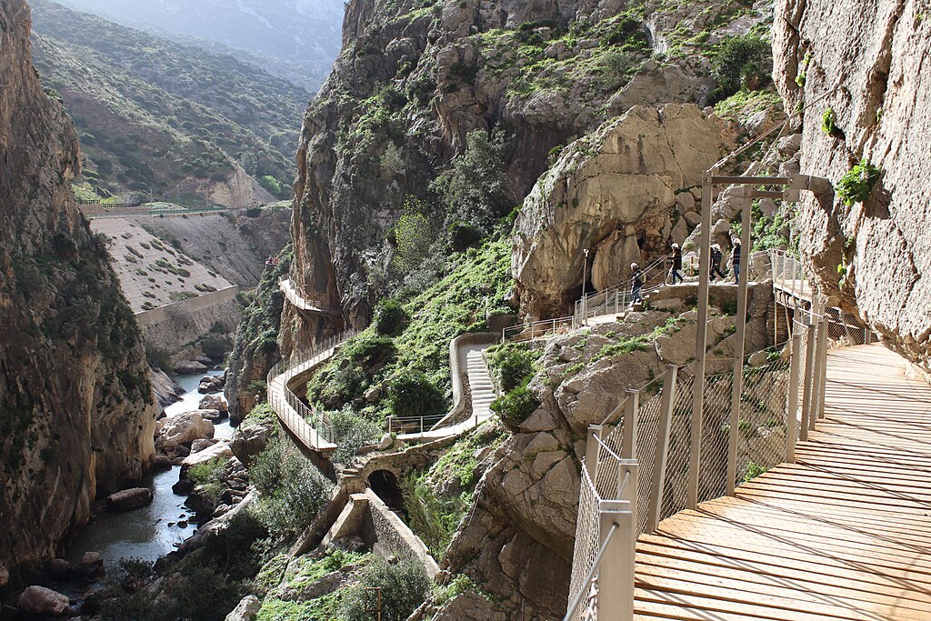 El Caminito del Rey es una pasarela peatonal colgada en las paredes del Desfiladero de los Gaitanes, en la provincia de Málaga. Suspensa a más de cien metros sobre el río Guadalhorce, atraviesa cañones espectaculares y túneles de roca, convirtiendo la ruta en una experiencia paisajística única y apta para visitantes tras su completa rehabilitación.
